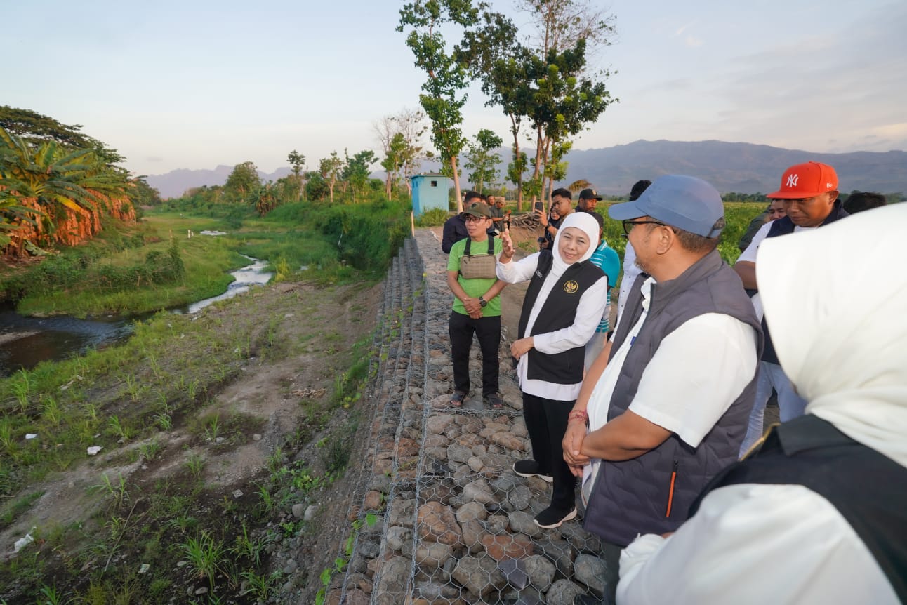 SITUBONDO, headlinejatum.com– Gubernur Khofifah Indar Parawansa meninjau pemasangan bronjong di Sungai Selowogo, Desa Mlandingan Kulon, Kecamatan Mlandingan, Kabupaten Situbondo, Sabtu (27/9).