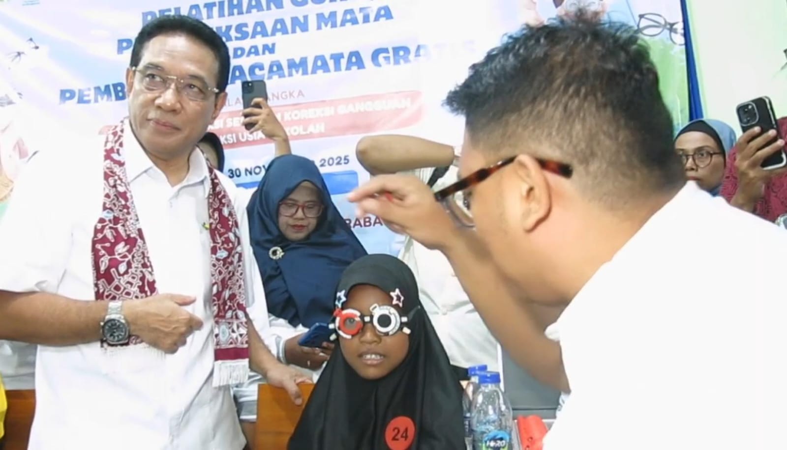 Wamenkes Benjamin Paulus Octavianus datang langsung ke SDN Bulak Rukem 1 untuk melihat proses pemeriksaan mata dan pemberian kacamata gratis yang diberikan kepada ratusan siswa di sana.