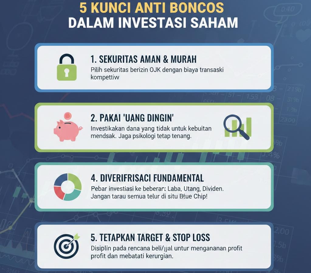 “Don’t put all your eggs in one basket.” Jangan habiskan seluruh modal Anda hanya pada satu saham atau satu sektor saja. Jika satu sektor sedang turun, Anda masih memiliki cadangan di sektor lain yang mungkin sedang menguat. Diversifikasi adalah kunci utama meminimalisir risiko “boncos” secara total.