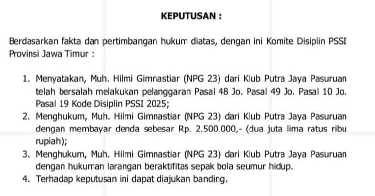 Surabaya, Headlinejatim.com– Meski telah dijatuhi sanksi berat berupa larangan beraktivitas di dunia sepak bola seumur hidup, pemain PS Putra Jaya Pasuruan, Muhammad Hilmi Gimnastiar, masih memiliki celah hukum. Komite Disiplin (Komdis) PSSI Jawa Timur menyatakan bahwa putusan tersebut belum bersifat inkrah sepenuhnya karena masih tersedia mekanisme banding.