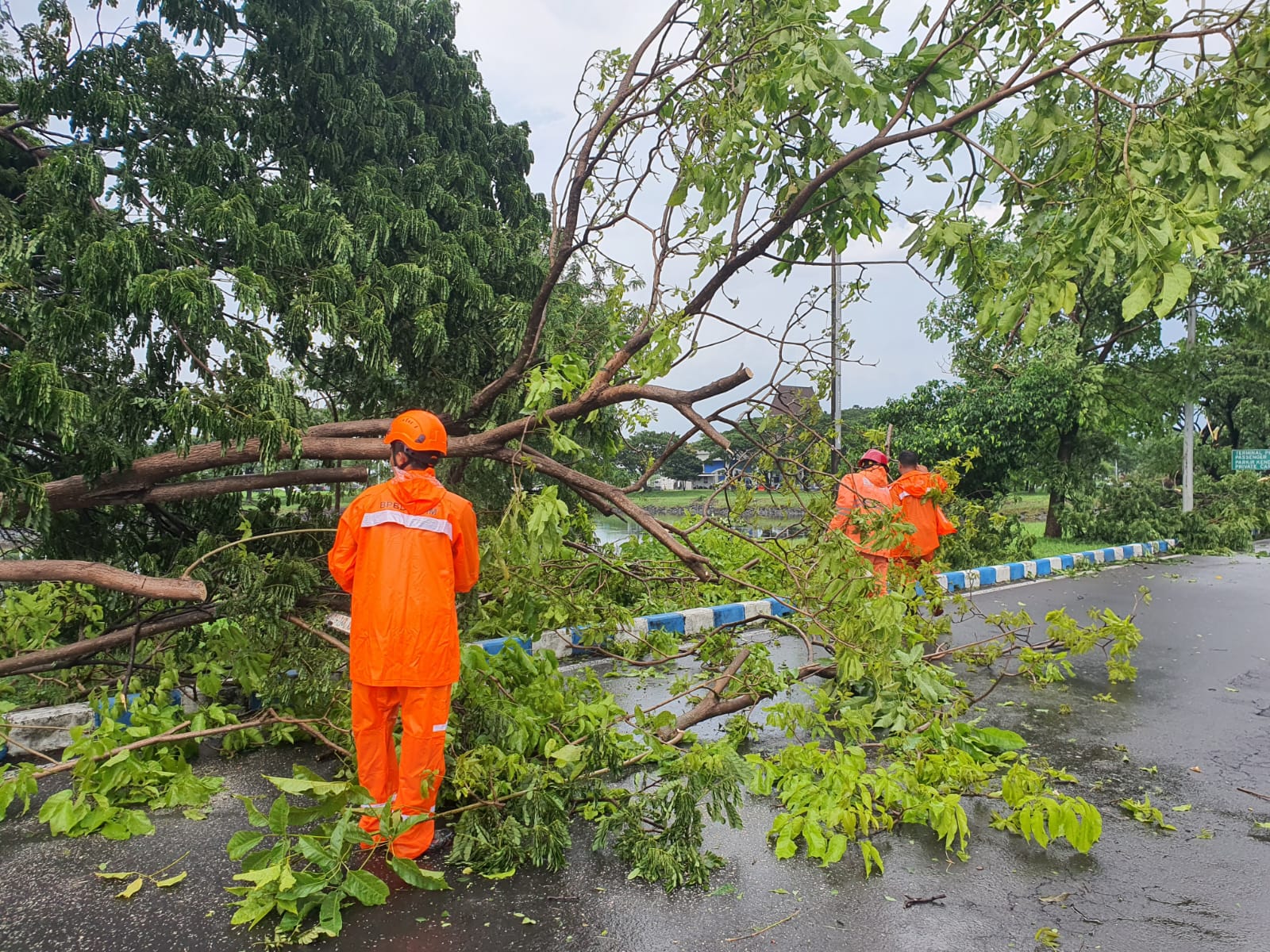 Sejumlah personel Tim Reaksi Cepat (TRC) BPBD Jatim melakukan asesmen dan evakuasi terhadap puluhan pohon yang tumbang di sepanjang jalan akses menuju Terminal 1. Petugas di lapangan fokus melakukan pembersihan material kayu, dahan, hingga ranting pohon yang sempat menutup akses jalan utama bandara.