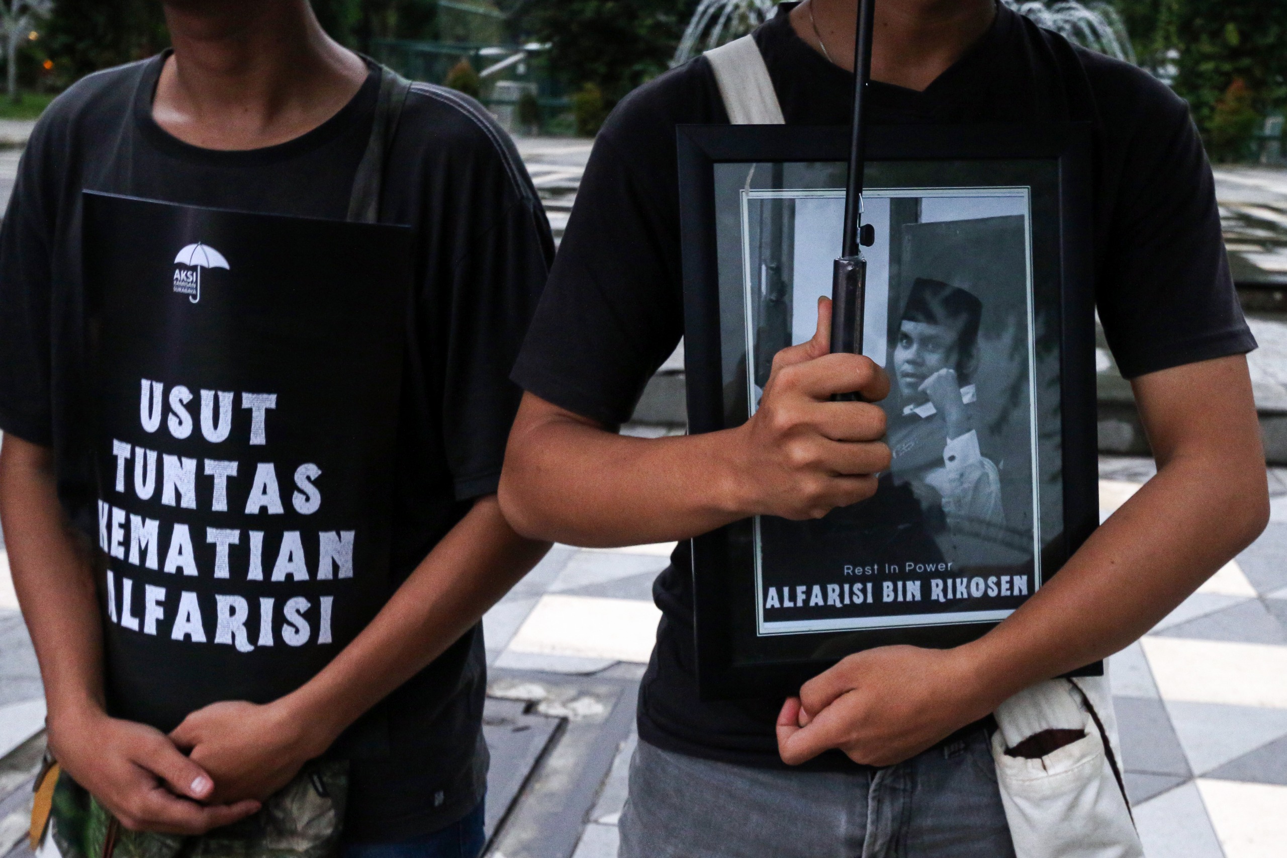 Aktivis Jaringan Solidaritas Korban untuk Keadilan membawa foto Alfarisi Bin Rikosen saat aksi kamisan di Taman Apsari, Surabaya, Kamis (8/1/2026). (Foto: Muhammad Iffan Maulana)