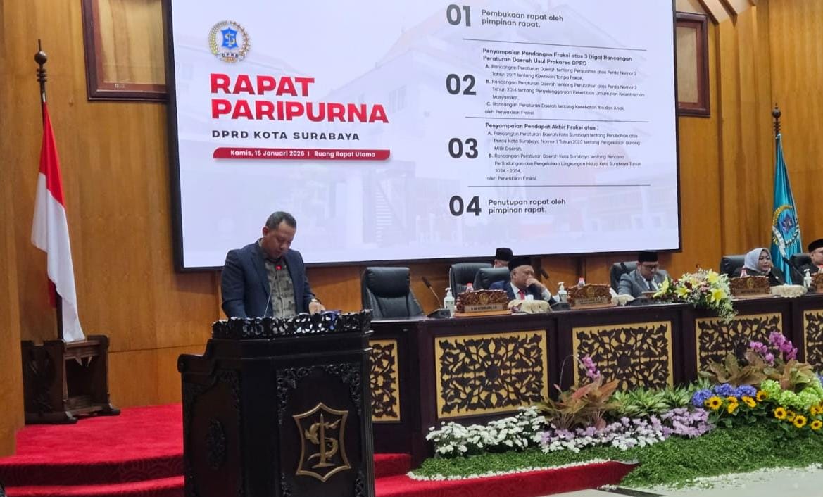 Surabaya, HeadlineJatim.com – DPRD Kota Surabaya menggelar rapat paripurna dengan agenda penyampaian pendapat akhir fraksi terhadap dua Rancangan Peraturan Daerah (Raperda) baru, Kamis (15/1/2026).