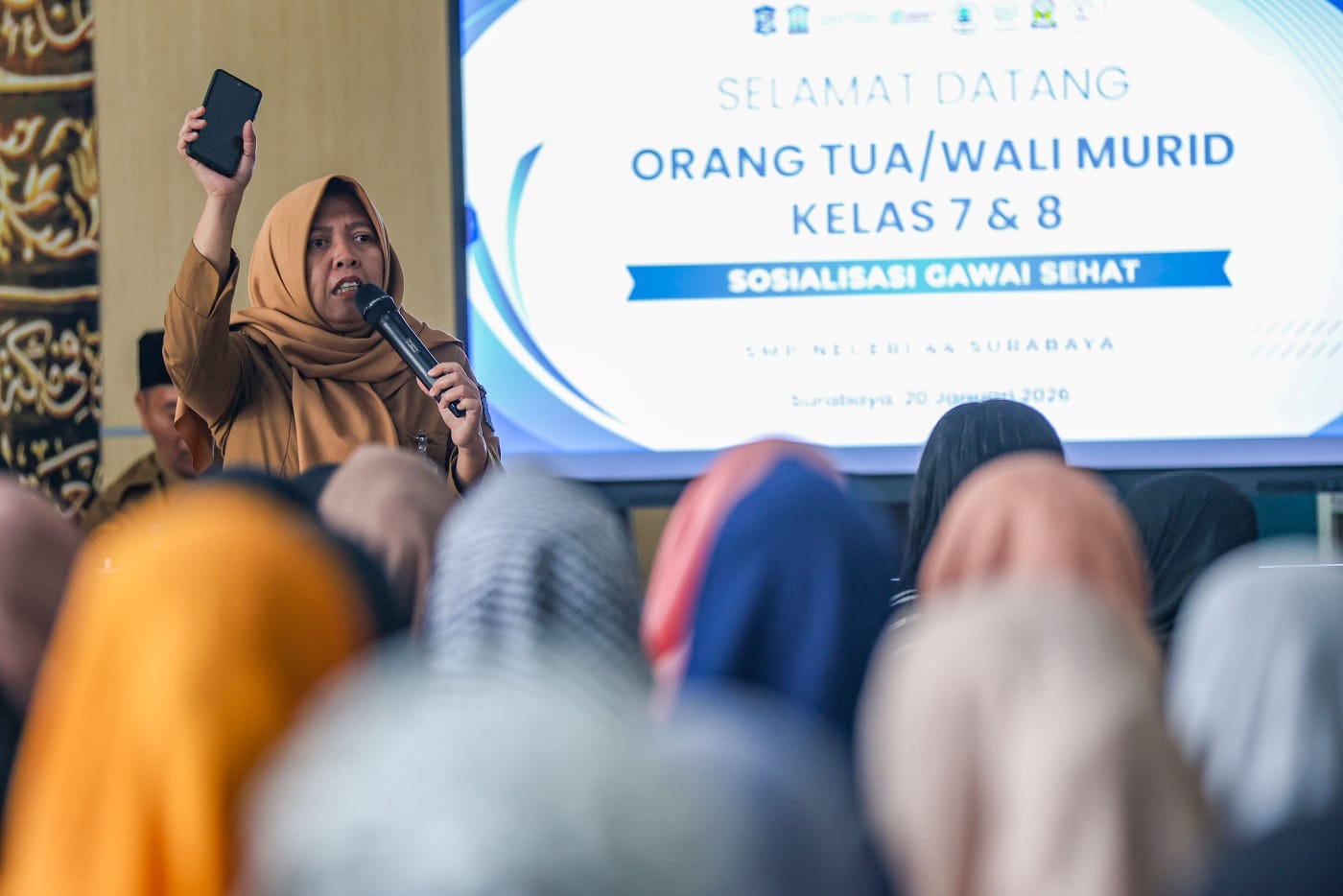 Langkah konkret tersebut diwujudkan melalui sosialisasi yang digelar di SMP Negeri 44 Surabaya, Selasa (20/1/2026). Ratusan wali murid hadir untuk memahami pentingnya peran keluarga dalam membentengi anak dari risiko aktivitas digital yang tidak sehat.