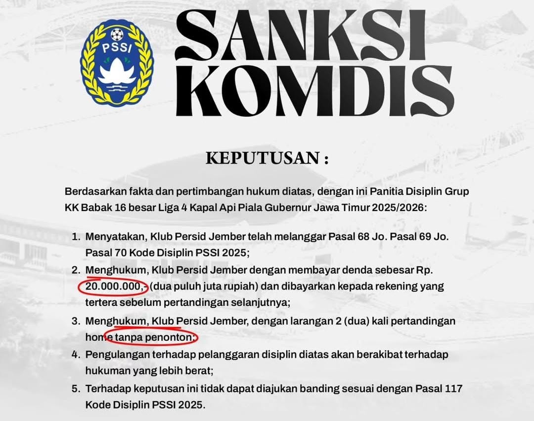 Merespons hal itu, Pandis Grup KK Babak 16 Besar Liga 4 Kapal Api Piala Gubernur Jawa Timur 2025/2026 mengeluarkan Surat Keputusan Nomor 01/PANDIS-16 BESAR/PSSI-JTM/I/2026 pada Selasa (20/1/2026). Persid Jember dinyatakan melanggar Kode Disiplin PSSI 2025.