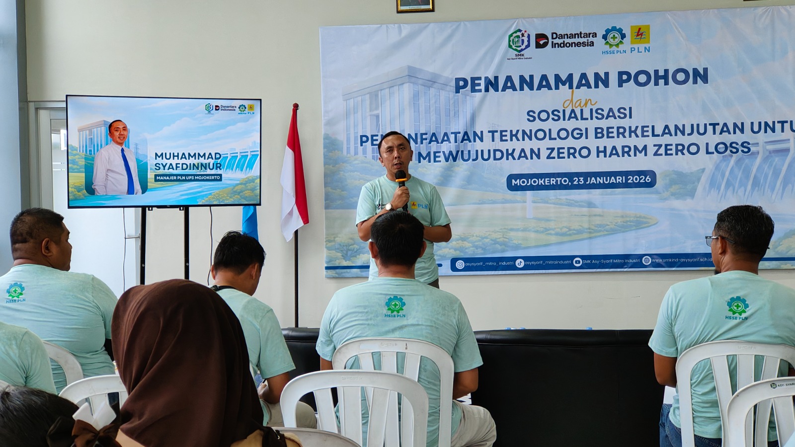 Mojokerto, headlinejatim.com– Dalam rangka menyukseskan Bulan K3 Nasional 2026, PLN UP3 Mojokerto menggelar kegiatan Penanaman Pohon dan Sosialisasi Pemanfaatan Teknologi Berkelanjutan untuk mewujudkan Zero Harm Zero Loss di SMK Asy Syarif Mojokerto, Jumat (23/1).