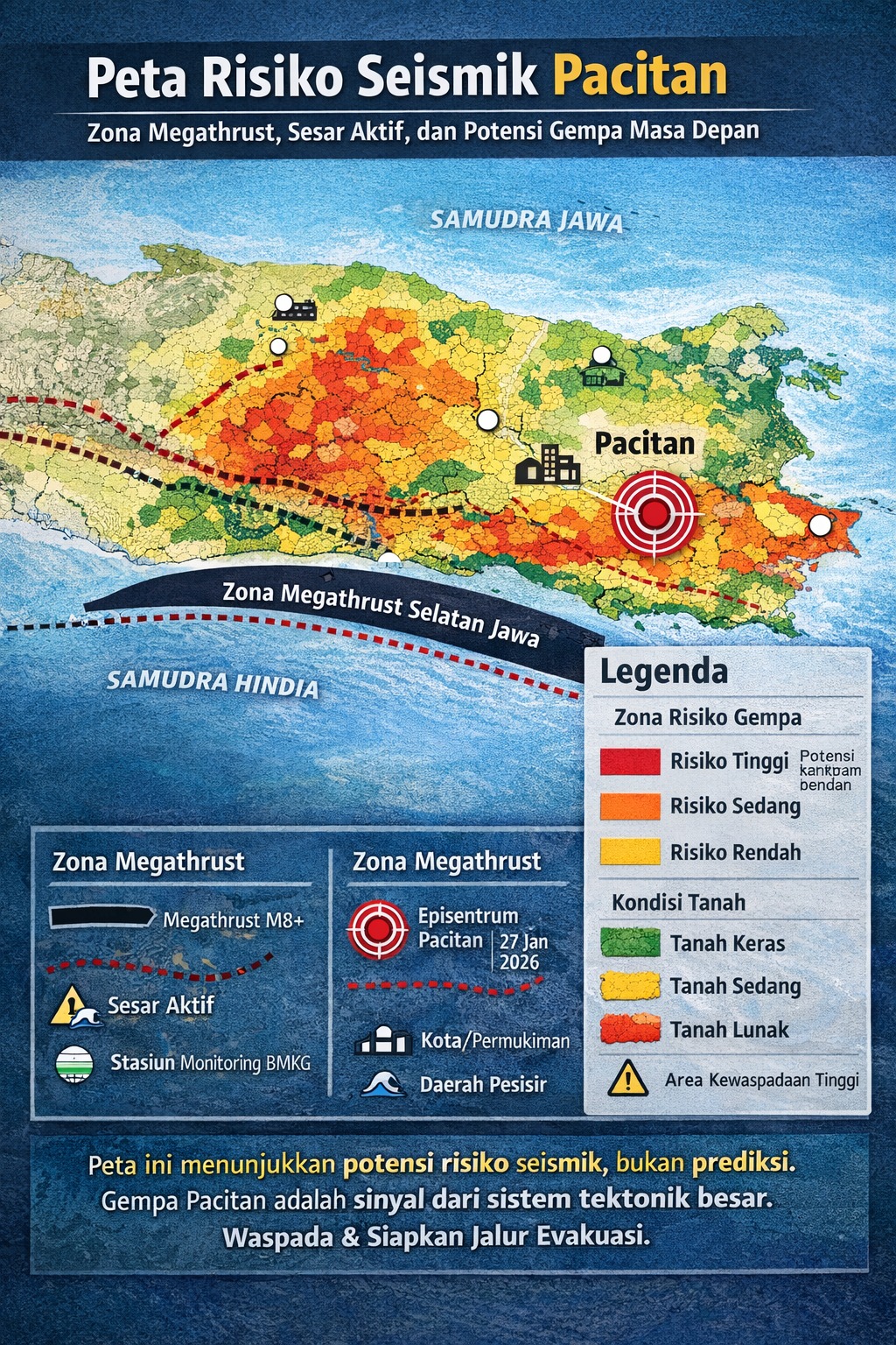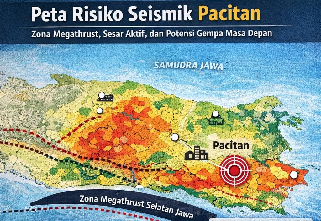 Pacitan, Headlinejatim.com– Selasa, 27 Januari 2026, Gempa bumi tektonik berkekuatan Magnitudo 5,5 (update M5,7) mengguncang wilayah Pacitan pada 08.20 WIB. Getaran ini terasa hingga Malang, Surabaya, bahkan Bali. Namun gempa pagi ini lebih dari sekadar getaran: ia adalah sinyal dari sistem tektonik besar di bawah Pulau Jawa, terbentuk melalui jutaan tahun proses geologi. Para ahli menyebutnya “narasi bumi yang belum selesai”, sebuah peringatan alami sekaligus pelajaran sejarah geologi yang hidup.