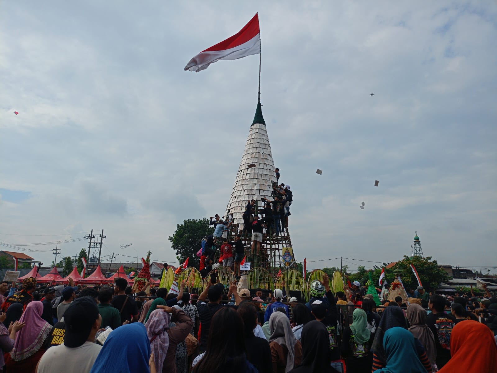 Sidoarjo, HeadlineJatim.com – Warga Desa Sedengan Mijen, Krian, Sidoarjo baru saja bikin aksi yang mind-blowing! Menyambut bulan Ramadan, mereka menggelar tradisi Ruwat Desa dengan cara yang nggak biasa: bikin tumpeng tempe raksasa setinggi 14 meter.