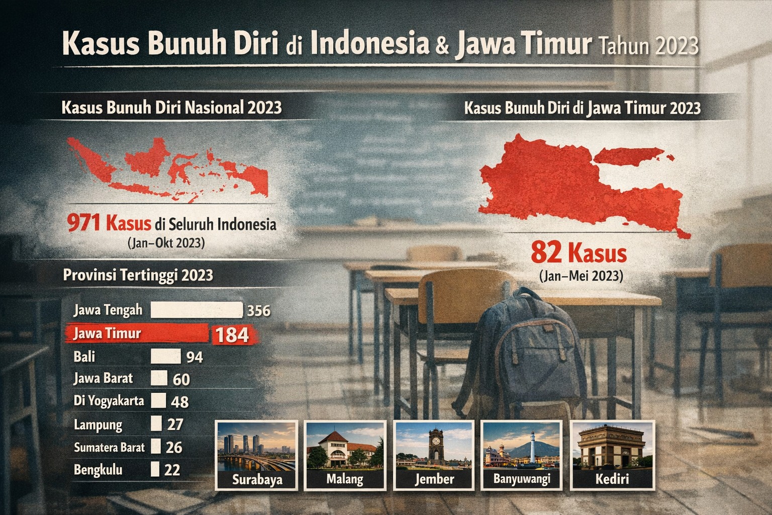 Data ini menunjukkan bahwa Jawa Timur berada di urutan kedua jumlah kasus bunuh diri tertinggi secara nasional pada tahun 2023.