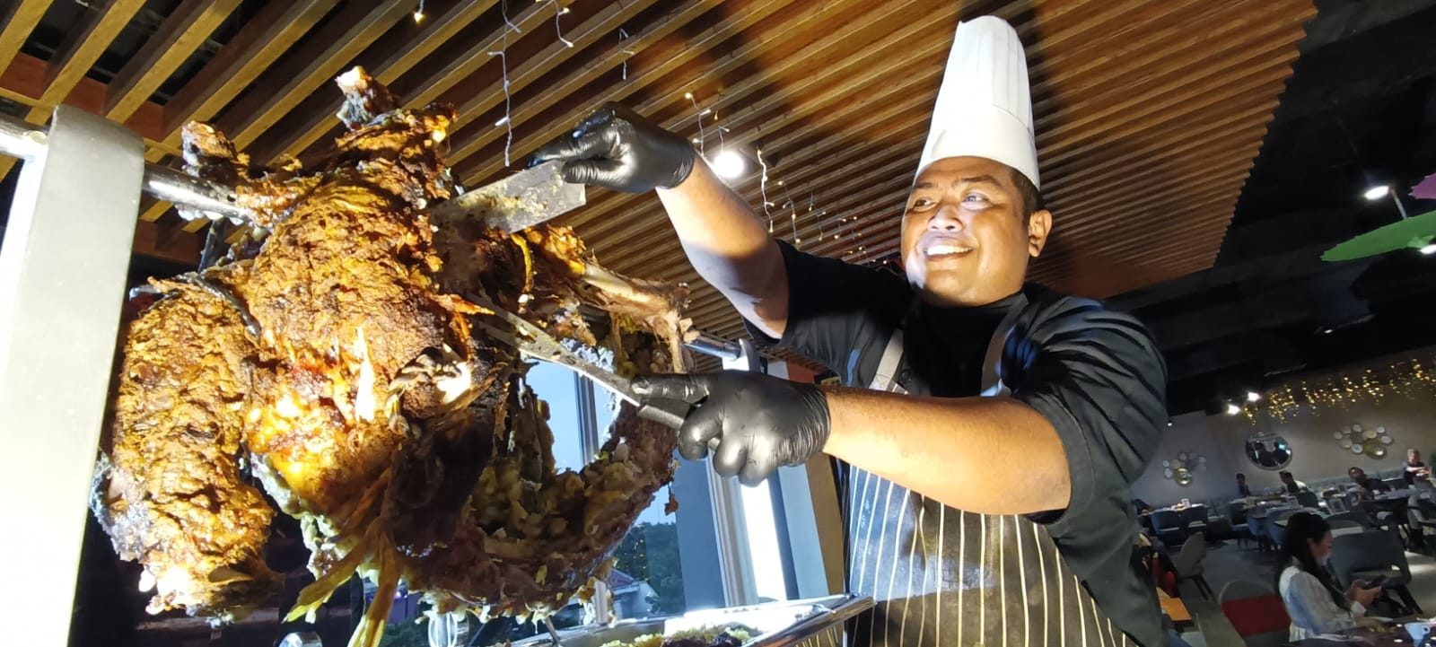 Surabaya, HeadlineJatim.com– Menjelang waktu berbuka, aroma rempah hangat mulai memenuhi ruangan. Wangi kardamom, kayu manis, dan daging kambing yang dipanggang perlahan seakan memanggil tamu untuk mendekat. Di antara deretan hidangan Grand Bazaar Ramadan Swiss-Belinn Manyar Surabaya, satu sajian berdiri paling gagah: Siknyancun kambing guling.