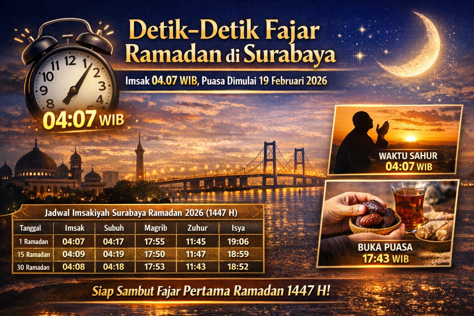 Surabaya, headlinejatim.com – Ramadan 1447 Hijriah resmi menyapa warga Surabaya pada Kamis, 19 Februari 2026. Alarm sahur akan berbunyi lebih dini. Tepat pukul 04.07 WIB, waktu imsak dimulai, disusul azan Subuh pukul 04.17 WIB.