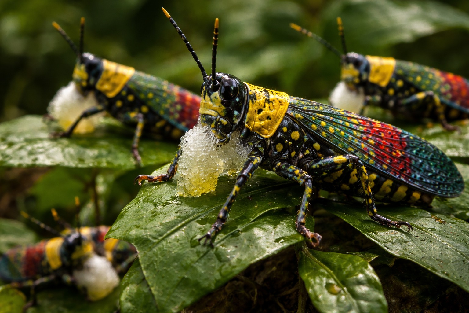 ​Spesies yang dikenal sebagai “belalang setan” ini memiliki warna mencolok—kombinasi merah, kuning, biru, dan hitam. Dalam biologi, warna ini disebut sinyal aposematik, yakni tanda peringatan bagi predator. Belalang ini mampu mengeluarkan cairan berbusa sebagai mekanisme pertahanan diri.