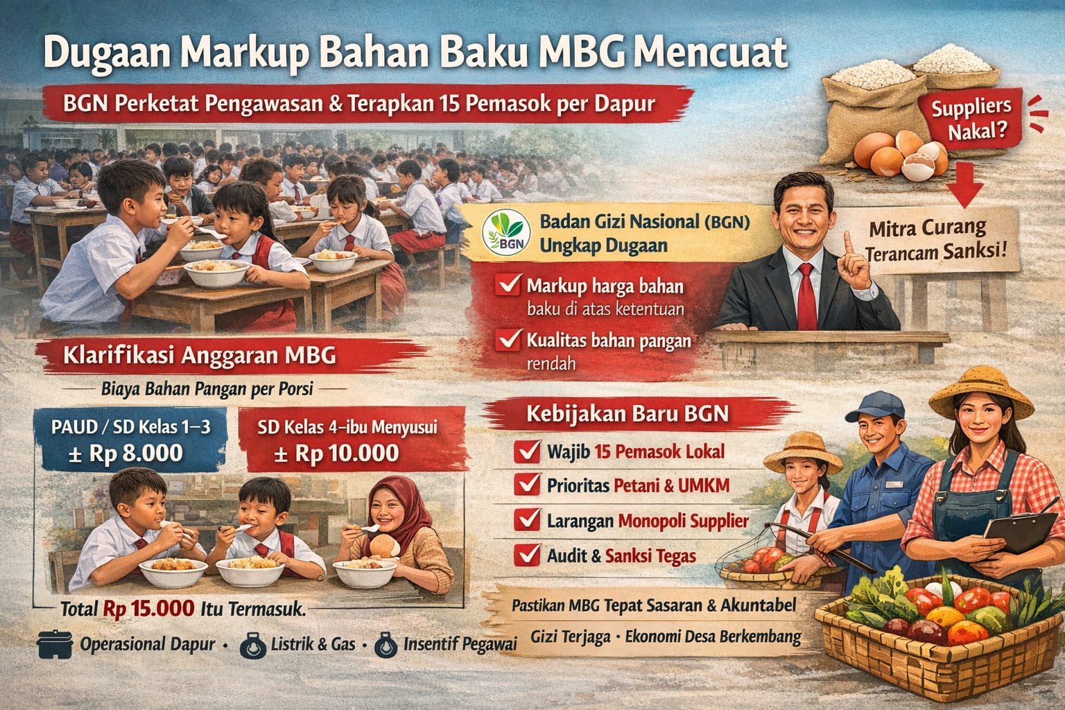 Untuk mencegah dominasi dan potensi markup, BGN menetapkan kebijakan baru. Setiap dapur MBG wajib melibatkan minimal 15 pemasok bahan pangan. Kebijakan ini bertujuan memutus ketergantungan pada satu atau dua pemasok, membuka persaingan harga yang sehat, serta memperkuat kontrol kualitas.