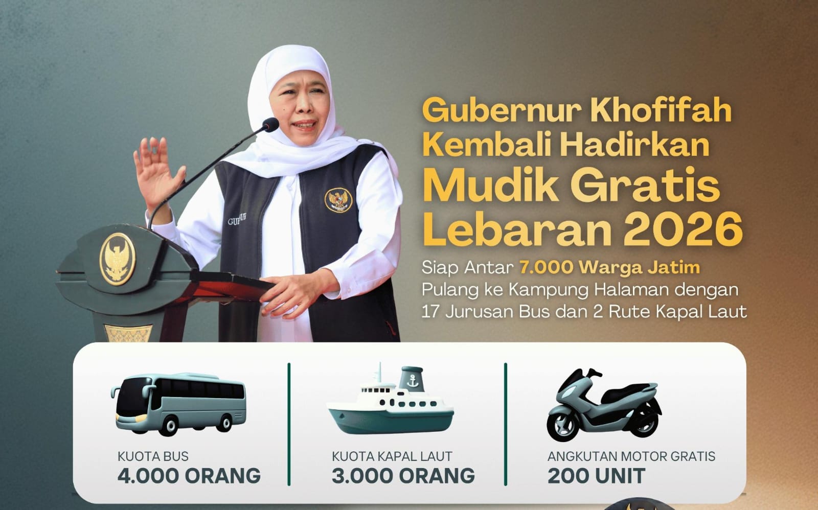 Mudik Gratis Jatim 2026, Gubernur Khofifah Siapkan 7.000 Tiket, Bus, Kapal, dan Motor Gratis untuk Warga