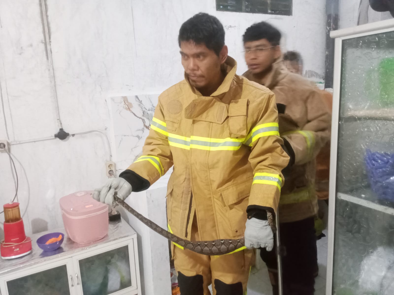 ”Setelah memastikan area kamar mandi kembali steril dan aman dari ancaman hewan melata, ular tersebut langsung dibawa ke markas Damkarla untuk penanganan lebih lanjut,” terangnya.