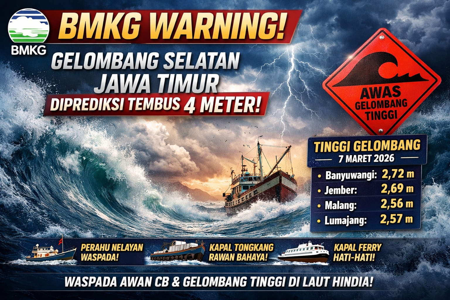 Surabaya, HeadlineJatim.com – Peringatan dini kembali dikeluarkan Badan Meteorologi, Klimatologi, dan Geofisika (BMKG) terkait potensi gelombang tinggi di perairan Jawa Timur. Gelombang laut di wilayah selatan provinsi ini diprediksi dapat mencapai hampir 3 meter dan berpotensi mendekati 4 meter, sehingga berisiko terhadap keselamatan aktivitas pelayaran.