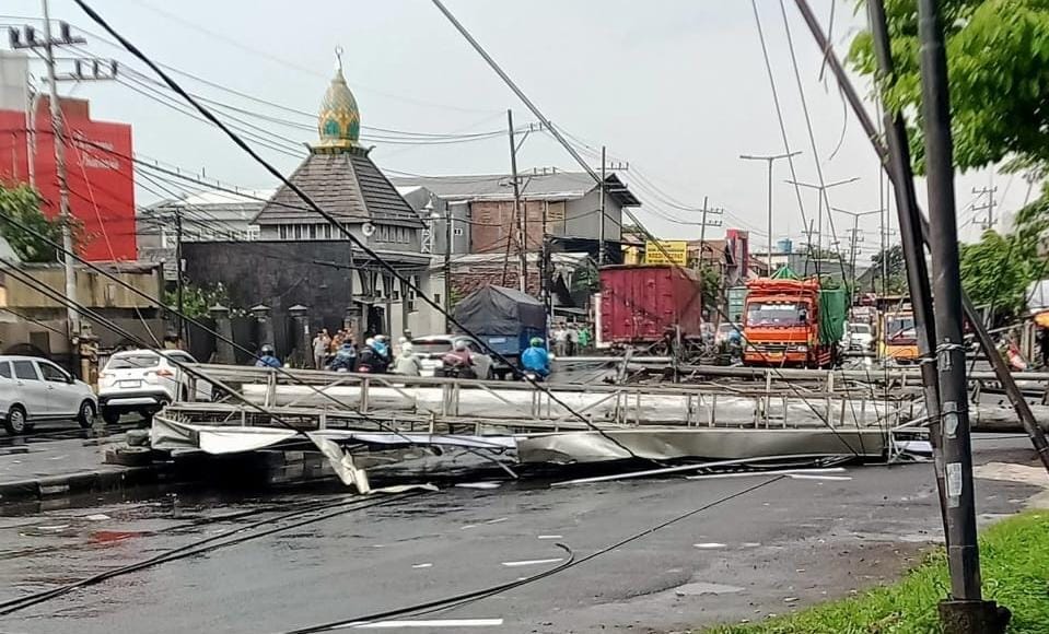 “Sekitar pukul 14.00 WIB, papan itu sudah terlihat goyang terkena angin kencang. Lima menit kemudian langsung ambruk menimpa kabel dan menarik tiang-tiang di sekitarnya sampai roboh,” jelas Triyanto.