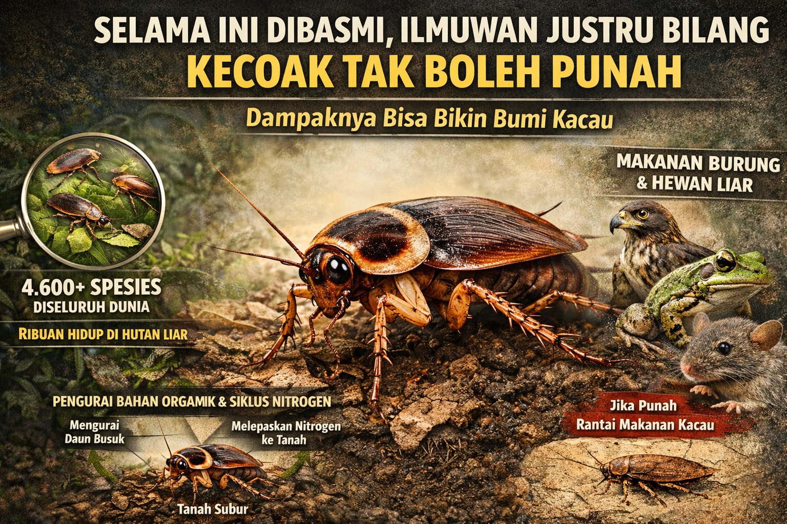 Namun di balik reputasi buruknya, para ilmuwan justru mengingatkan sesuatu yang terdengar paradoks: Bumi bisa mengalami gangguan ekosistem serius jika kecoak benar-benar punah.