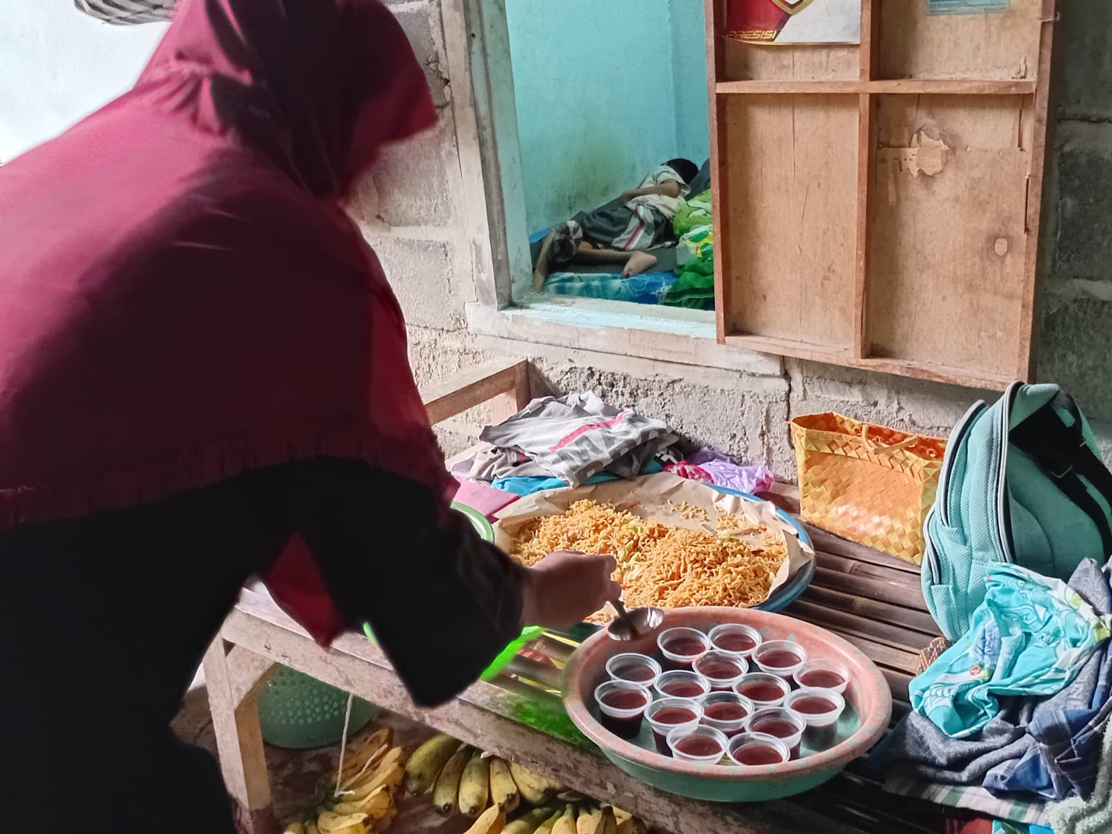 Di sela merawat putranya yang terbaring di kasurnya, Deni Riyaningsih, sedang menyiapkan makanan. (Istimewa)