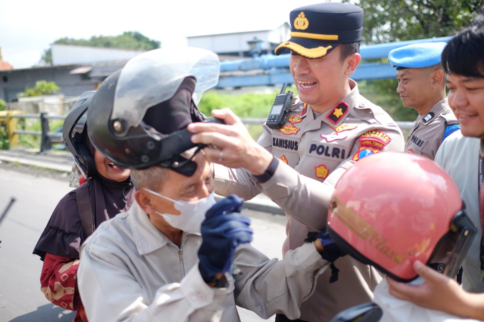 Kapolsek Taman Sidoarjo, Kompol Kanisus Franata mengganti helm pengendara motor yang sudah tidak layak pakai.(Istimewa)