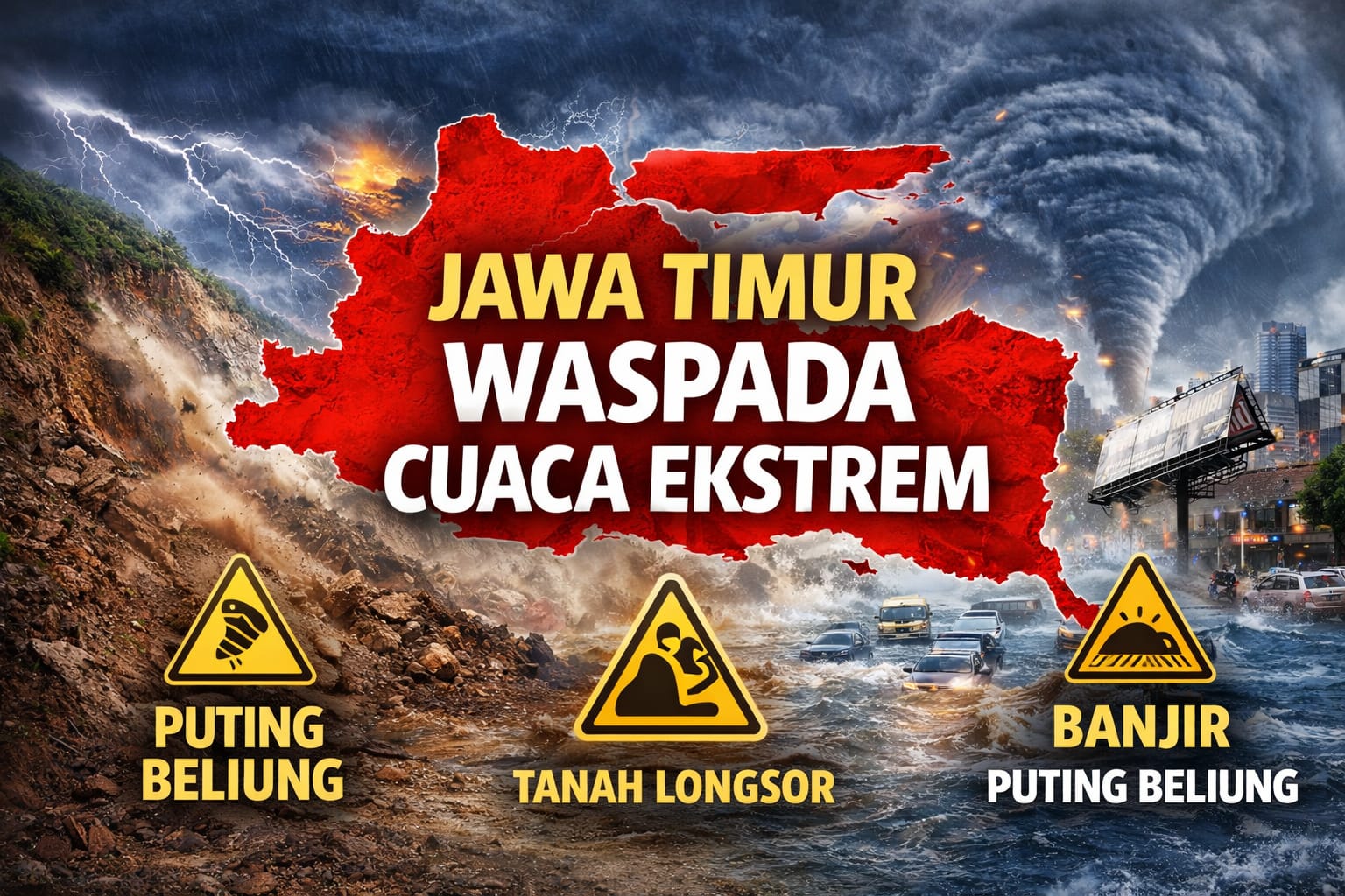 Surabaya, HeadlineJatim.com – Seluruh wilayah di Jawa Timur diminta meningkatkan kewaspadaan setelah Badan Meteorologi Klimatologi dan Geofisika mengeluarkan peringatan dini potensi cuaca ekstrem pada 11–20 Maret 2026. Kondisi atmosfer yang tidak stabil berpotensi memicu hujan lebat, angin kencang, hingga puting beliung di berbagai daerah.