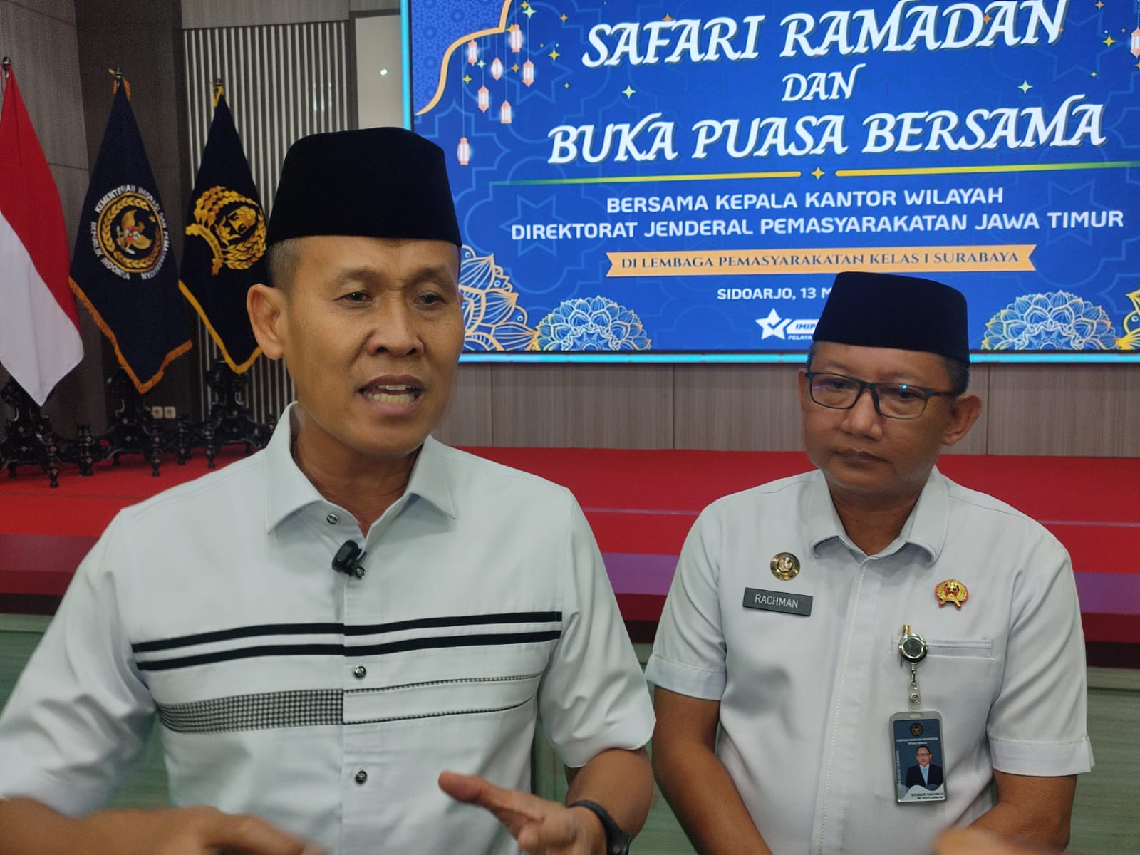 Sidoarjo, HeadlineJatim.com– Kepala Kantor Wilayah (Kakanwil) Kemenkumham Jawa Timur, Kadiyono, memimpin langsung kegiatan Safari Ramadan Pemasyarakatan di Lapas Kelas I Surabaya, Porong, Sidoarjo, Jumat (13/3/2026). Momentum ini dimanfaatkan jajaran pemasyarakatan untuk berbagi santunan sekaligus mempererat silaturahmi dengan masyarakat sekitar.