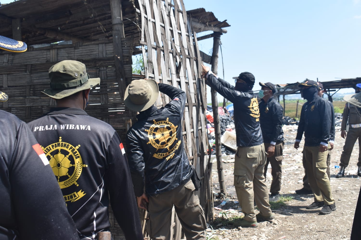 Petugas Satpol PP Kota Surabaya bersama Dinas Lingkungan Hidup Kota Surabaya menertibkan bangunan liar yang dijadikan gudang penumpukan sampah ilegal di kawasan TPA Benowo, Surabaya.(Foto:Istimewa)