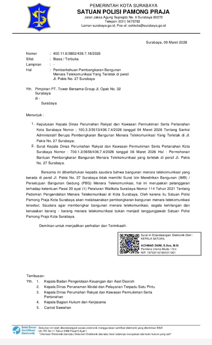 Kepastian hukum terkait keberadaan tower tersebut sebelumnya juga telah ditegaskan melalui surat resmi tertanggal 9 Maret 2026 dari Satuan Polisi Pamong Praja Kota Surabaya.