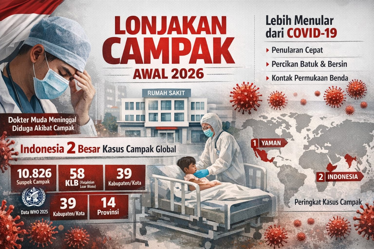 Dalam konteks global, Indonesia juga berada dalam posisi yang perlu diwaspadai. Berdasarkan kompilasi data World Health Organization yang dirilis melalui sistem surveilans global dan dirujuk berbagai lembaga kesehatan, Indonesia tercatat sebagai negara dengan jumlah kasus campak tertinggi kedua di dunia pada periode paruh kedua 2025, setelah Yaman.
