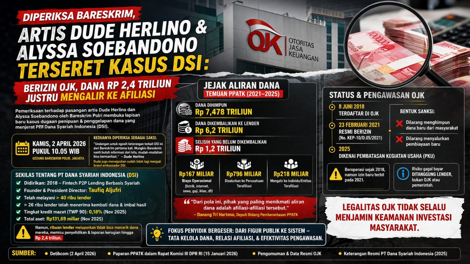 JAKARTA, HeadlineJatim.com – Pemeriksaan terhadap pasangan artis Dude Herlino dan Alyssa Soebandono oleh Bareskrim Polri membuka lapisan lain dari kasus besar yang menjerat PT Dana Syariah Indonesia (DSI). Namun, sorotan kini bergeser, bukan lagi sekadar figur publik, melainkan jejak aliran dana jumbo dan sistem pengelolaan yang dipertanyakan.