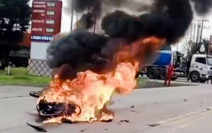 Dalam video amatir yang beredar, terlihat kepulan asap hitam membumbung tinggi dari motor Supra X yang terbakar di tengah jalan, sementara korban lainnya tergeletak tak berdaya.