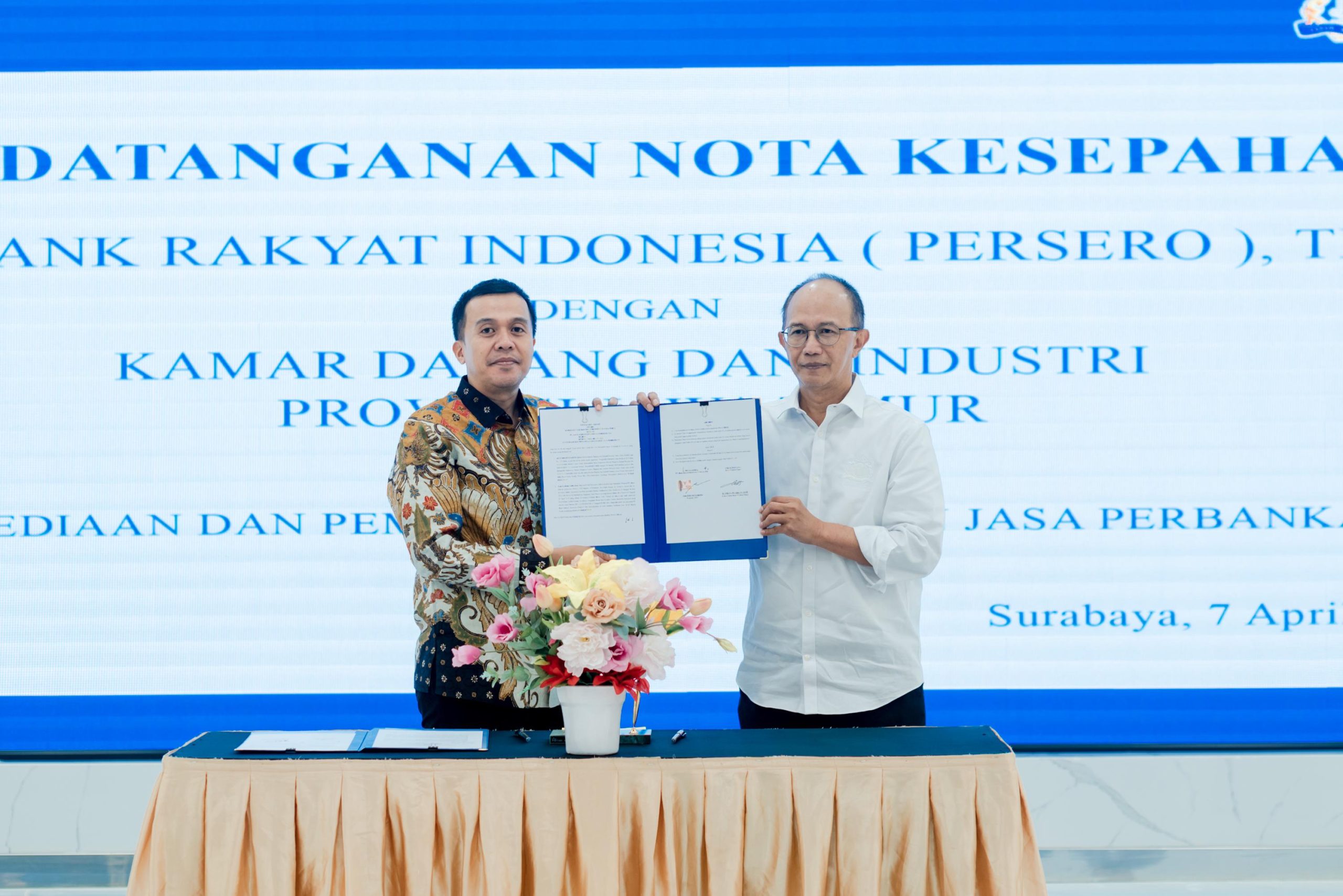 Penandatanganan nota kesepahaman (MoU) dilakukan oleh Ketua Umum Kadin Jawa Timur, Adik Dwi Putranto, dan Regional Chief Executive Officer BRI Region 12 Surabaya, Reza Syahrizal Setiaputra. Kolaborasi ini difokuskan pada penyediaan dan pemanfaatan layanan jasa perbankan guna mendukung aktivitas ekonomi para pelaku usaha.