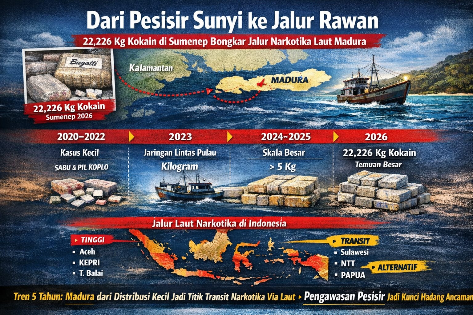 Berdasarkan kompilasi tren penindakan dari Badan Narkotika Nasional (BNN) dan kepolisian di Jawa Timur sepanjang 2020–2026, wilayah Madura, meliputi Bangkalan, Sampang, Pamekasan hingga Sumenep mengalami pergeseran peran dari distribusi lokal menjadi titik transit yang semakin strategis dalam rantai peredaran narkotika.