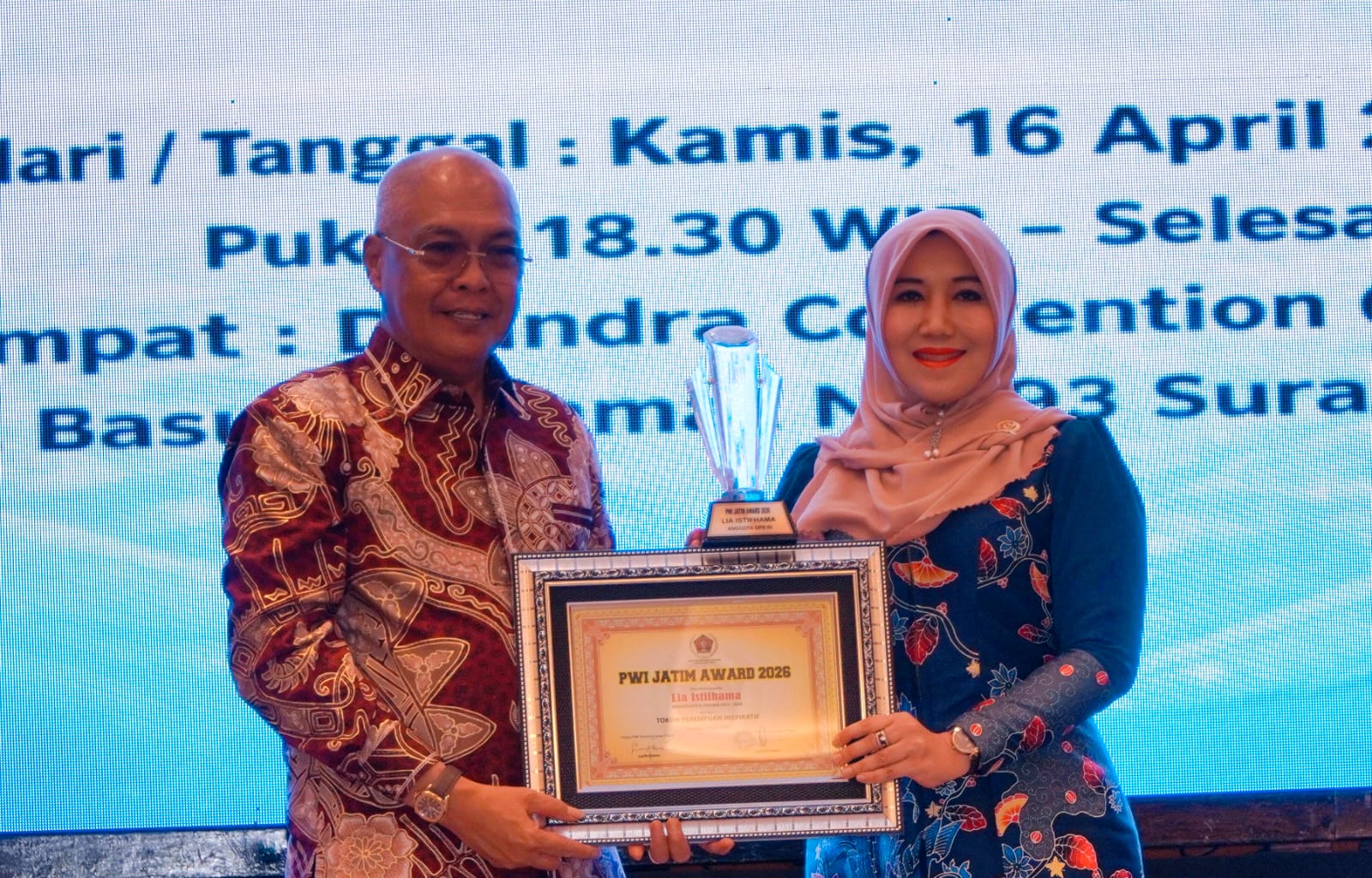 Penyerahan penghargaan yang berlangsung khidmat di Surabaya ini mempertegas posisi Lia sebagai salah satu legislator paling berpengaruh dan responsif di tanah air.
