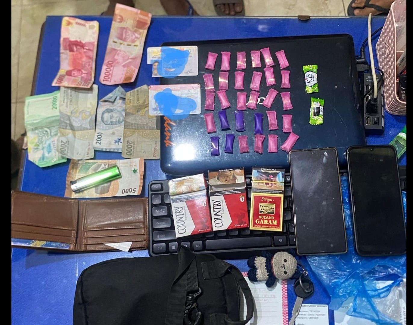 Dari hasil penggeledahan, polisi menemukan barang bukti berupa 30 paket kecil diduga sabu, dua bungkus rokok, dua unit ponsel, satu unit sepeda motor Honda Beat warna hitam, serta uang tunai milik kedua terduga pelaku.