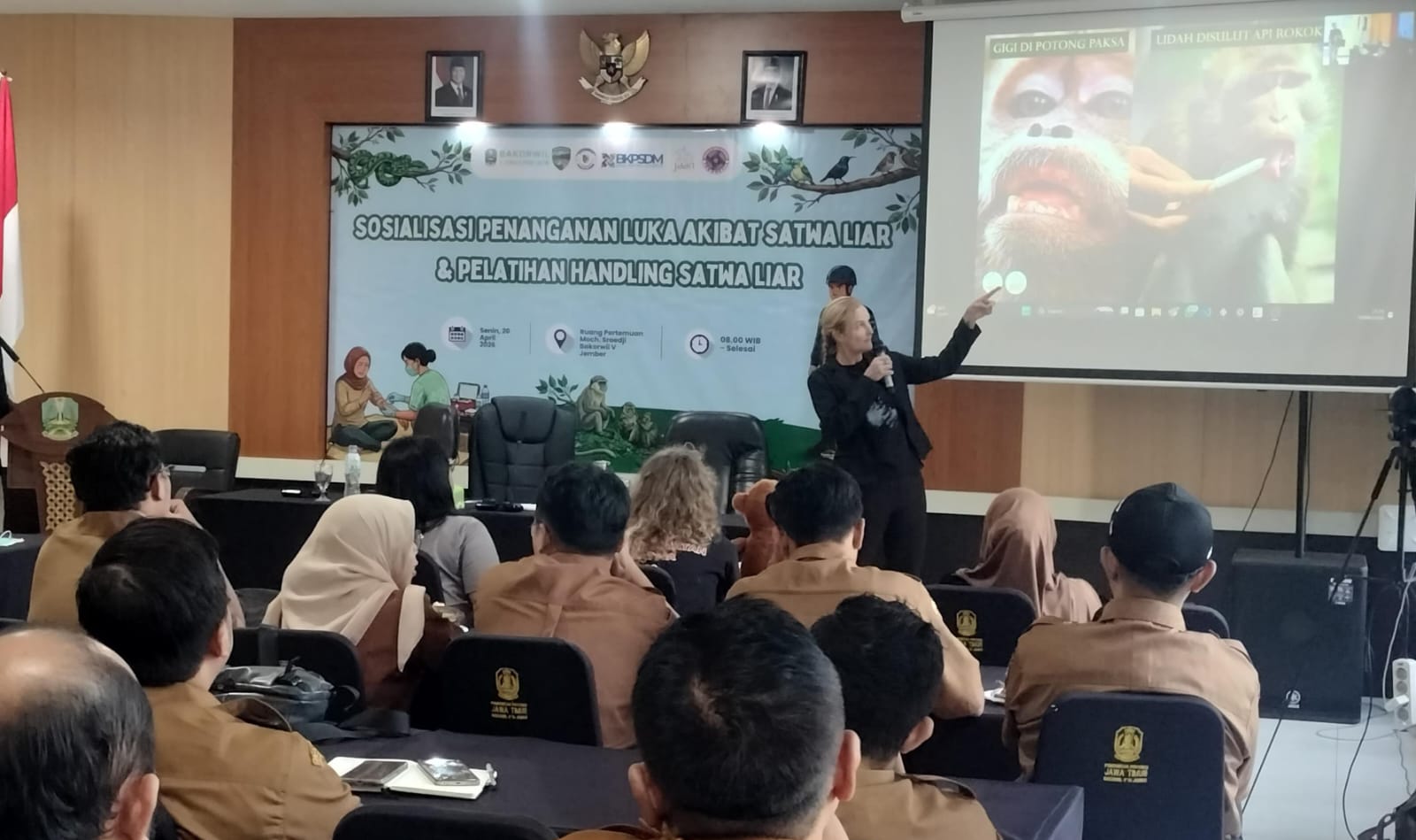 Hal tersebut disampaikan Femke dalam sosialisasi penanganan luka satwa liar di Kantor Bakorwil V Jatim, Jember, Senin (20/4/2026). Kegiatan ini diikuti oleh 90 peserta dari unsur relawan, BPBD, BKSDA, hingga Dinas Kesehatan Jember.
