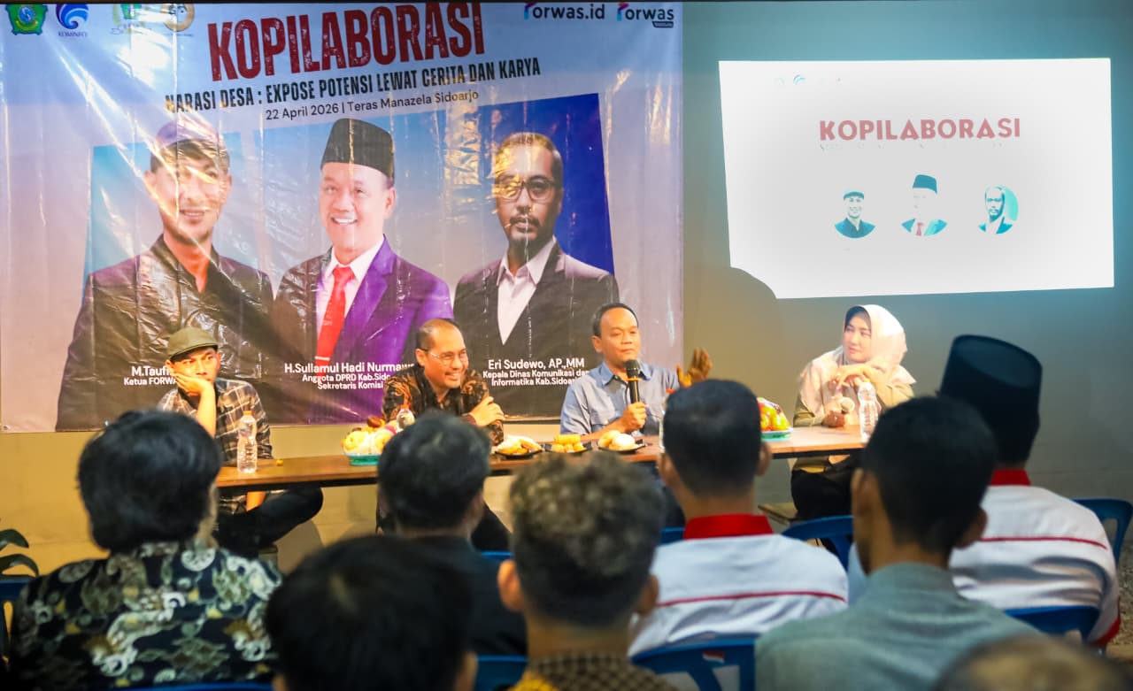 SIDOARJO, HeadlineJatim.com– Semangat membangun desa dari pinggiran menggema dalam diskusi “Kopilaborasi” bertajuk Narasi Desa: Expose Potensi Lewat Cerita dan Karya yang digelar Forum Wartawan Sidoarjo (Forwas) di Teras Manazela, Desa Klopo Sepuluh, Sukodono, Rabu (22/4/2026) malam.