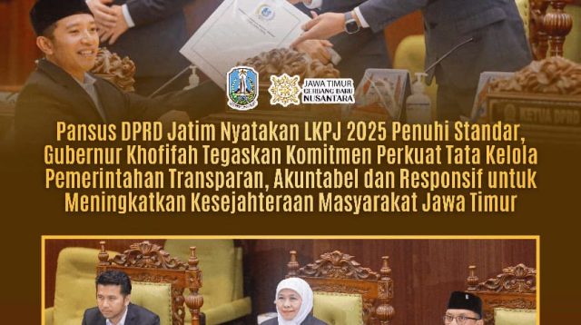SURABAYA, HeadlineJatim.com – Laporan Keterangan Pertanggungjawaban (LKPJ) Gubernur Jawa Timur Tahun Anggaran 2025 dinyatakan memenuhi (Baca Selengkapnya)