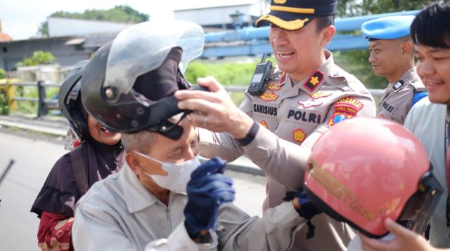 Kapolsek Taman Sidoarjo, Kompol Kanisus Franata mengganti helm pengendara motor yang sudah tidak layak pakai.(Istimewa) (Baca Selengkapnya)